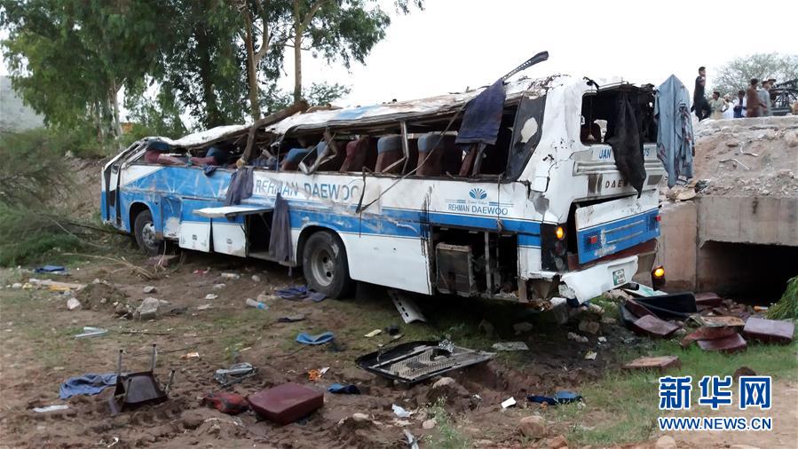 这是8月4日在巴基斯坦西北部开伯尔—普什图省科哈特地区拍摄的发生事故的大巴。 科哈特地区当日发生一起大巴与油罐车相撞事故,造成至少14人死亡,另有30多人受伤。 新华社发