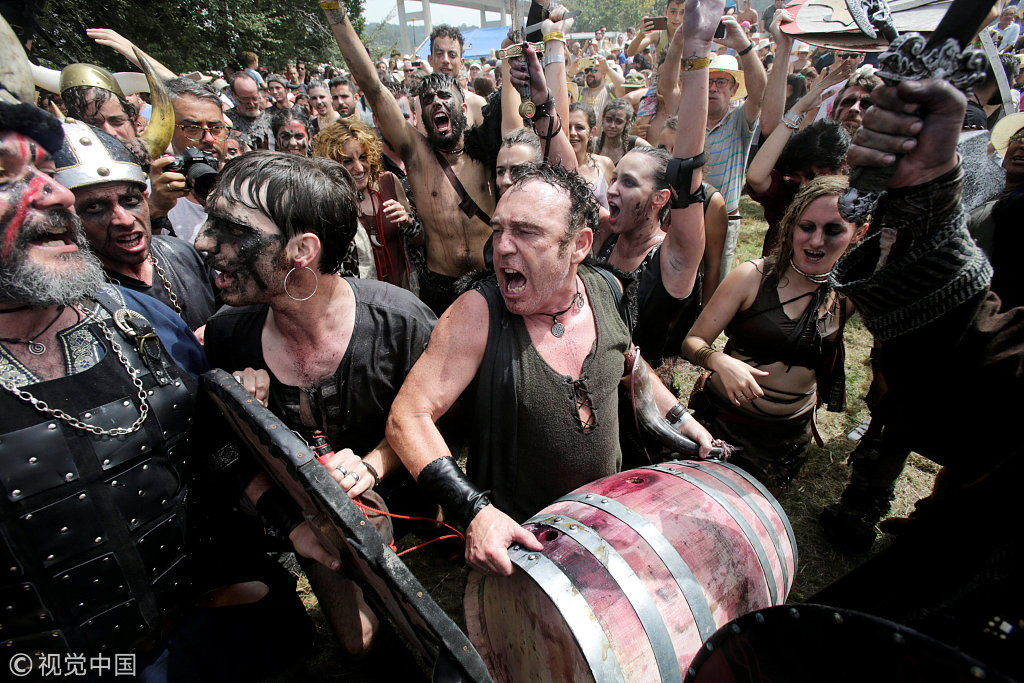 当地时间2018年8月5日,西班牙西北部小镇卡托伊拉举办维京海盗节,人们扮成维京人重现海盗入侵该地区的行动。图片来源:视觉中国。