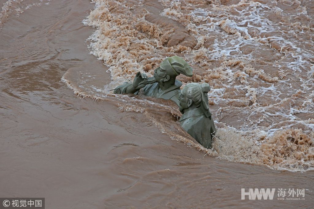 2018年8月3日,四川宜宾,“苏轼”和“黄庭坚”雕像浸泡在洪水中,水位已经接近没过两人的肩头。