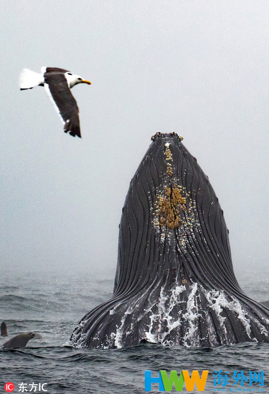 加州鲸鱼跃出海面捕食 险些撞翻游船