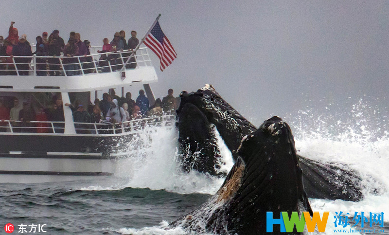 2018年8月6日报道(具体拍摄时间不详),一艘双层游船满载游客在美国加州蒙特雷湾水域观鲸。两头有4吨重的鲸鱼正一心觅食,突然就从海面跃出,出现在游船前,近在咫尺险些弄翻游船,吓得满船游客心中一惊,其中一头鲸鱼动作太大,更是弄得水花四溅。