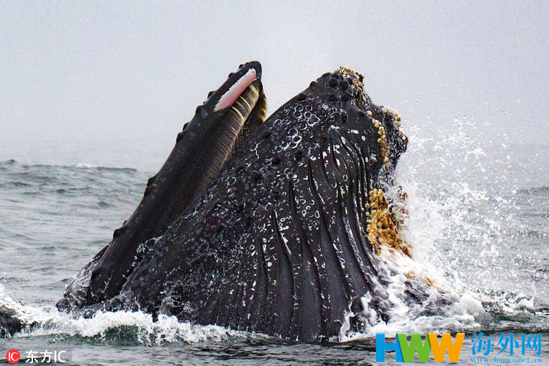 加州鲸鱼跃出海面捕食 险些撞翻游船