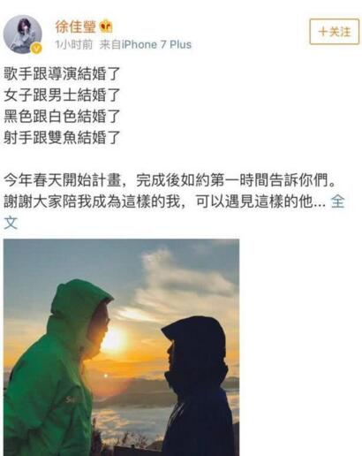 8月5日早上,徐佳莹在微博发长文宣布自己结婚的喜讯,并附上一张与老公深情对视的照片。