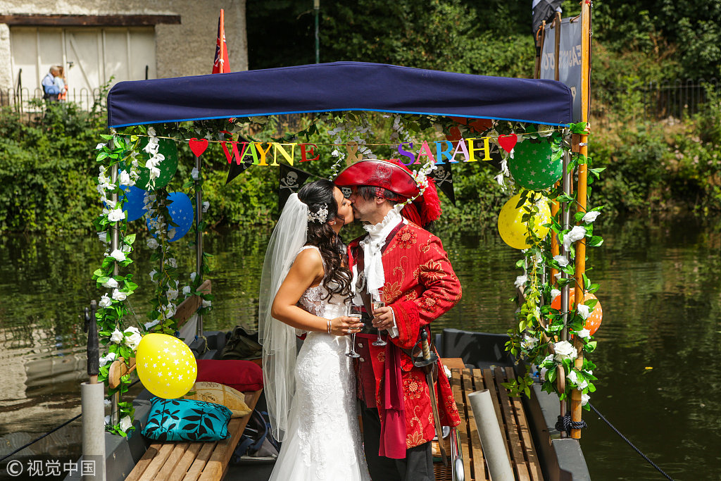 当地时间2018年8月4日,英国德比郡,由于新娘是《加勒比海盗》的狂热粉,43岁的新郎Wayne Mark Truman把自己装扮成“杰克船长”来迎娶28岁的Kirsty Page,打造了一场有模有样的海盗主题婚礼。除了新郎之外,数百名宾客也纷纷装扮成海盗,整个婚礼看起来像是一场海盗的集会。图片来源:视觉中国。