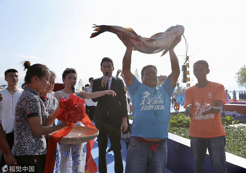 四川开渔获66斤“鱼王” 6000斤鱼免费吃