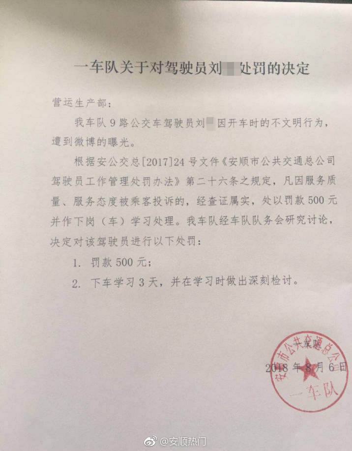 处罚决定中称:根据安公交总【2017】24号文件《安顺公共交通总公司驾驶员工作管理处罚办法》第26条规定,凡因服务质量、服务态度被乘客投诉的,经查证属实,处以500元并作下岗(车)学习处理。经车队队务会研究讨论,对刘师傅罚款500元,下车学习3天,并在学习时深刻检讨。