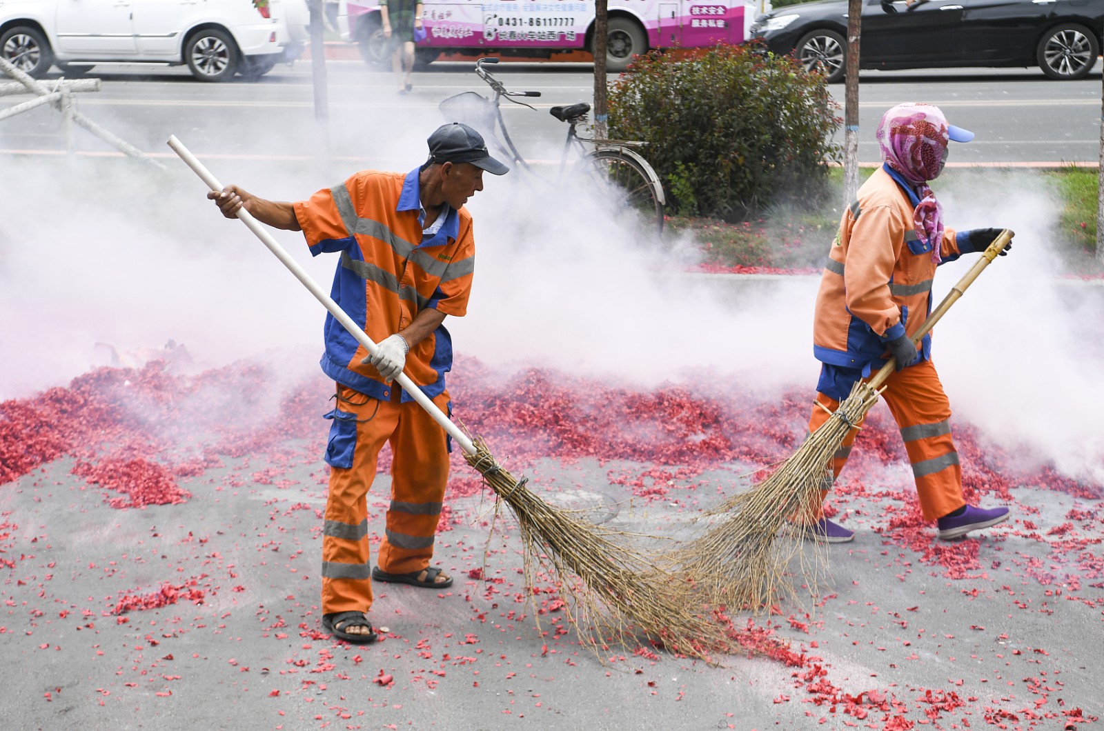 8月5日上午11点,在吉林省长春市农安县,一对新人结婚现场,动用重达几十吨,价格百万的大型吊车燃放鞭炮,这个燃放过程持续了几分钟,吸引大量市民围观,鞭炮纸瞬间将地面和周边车辆覆盖,为防止损坏车辆,主家将覆盖在车上的鞭炮纸扫掉,四五个环卫工人前来打扫卫生。(来源:视觉中国)