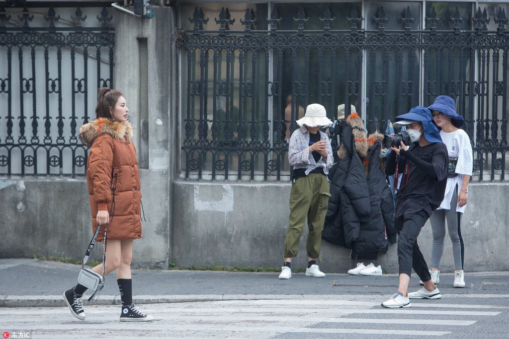 围巾、羽绒服裹得严严实实,还要摆出各种悠闲潇洒的姿势,高温下拍照的帅哥美女模特让人看得都出汗。(来源:东方IC)