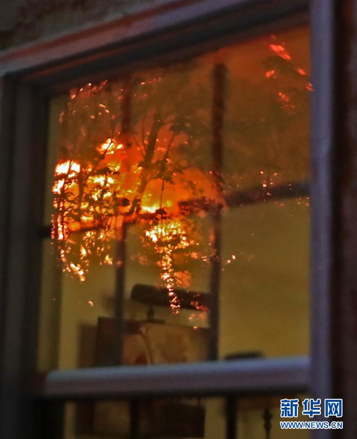 8月9日,在美国加利福尼亚州埃尔西诺湖地区,一栋房屋窗户上映照出山火。 新华社记者李颖摄