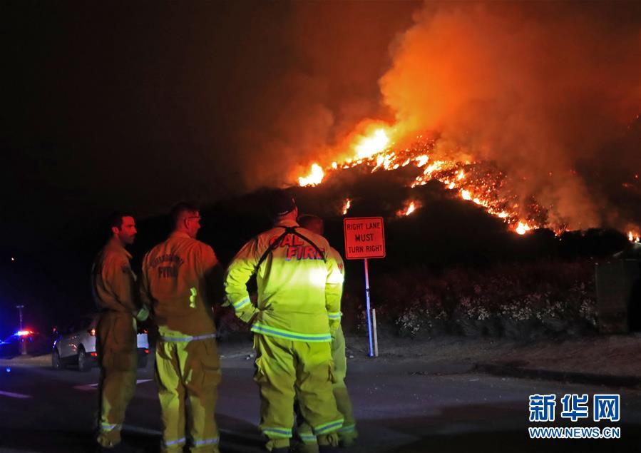 8月9日,在美国加利福尼亚州埃尔西诺湖地区,消防员观察火势。由于高温干燥天气持续,加州境内目前有10多处大规模山火正在燃烧。新华社记者李颖摄