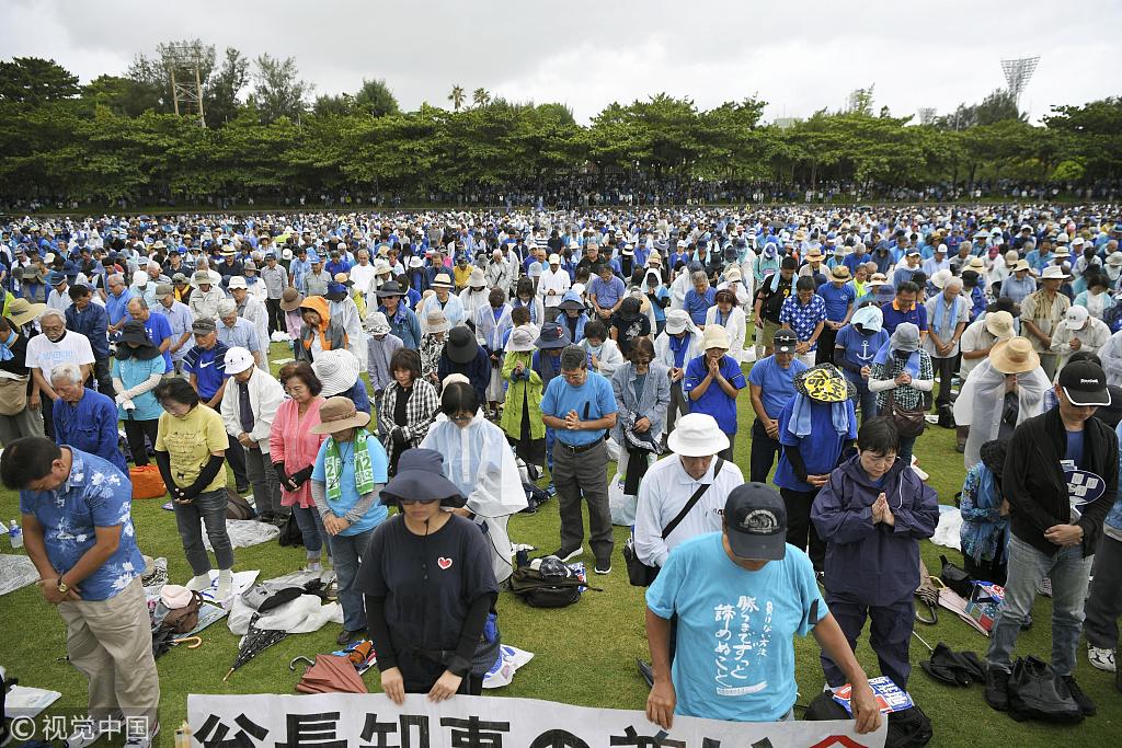 当地时间2018年8月11日,日本冲绳岛那霸,当地民众集会为8日逝世的冲绳县知事翁长雄志默哀,抗议美军普天间基地新址施工。为抗议美军普天间基地新址施工,“冲绳县民大会”在日本冲绳县那霸市的奥武山田径运动场举办。据日本每日新闻援引主办方消息,共约有7万人参加本次大会。