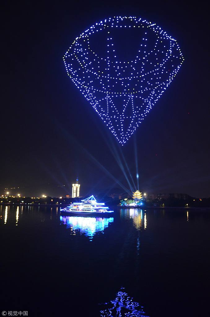 2018年8月10日晚,长沙市橘子洲头,777架无人机盘旋在空中变换着各种造型,打造大型告白现场。图片来源:视觉中国