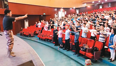 2018“平安留学”行前培训在贵州、成都等地举行。图为西南交通大学培训会现场,学生和教官在进行互动。 出国留学行前培训微信公众号供图