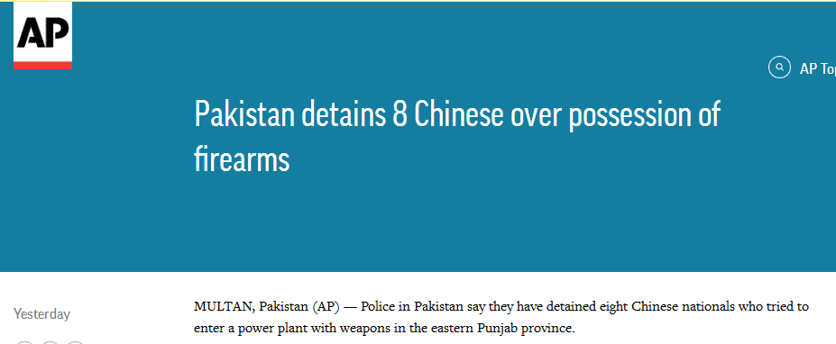 报道援引警官伊克巴尔(Zafar Iqbal)的话透露说,这8名中国人周日(12日)在萨希瓦尔(巴基斯坦东部城市)一座发电厂外的检查站被拦下,因为工作人员在他们的车内发现了一支泵动枪、一支手枪、一支步枪和弹药。伊克巴尔称,目前调查正在进行当中。