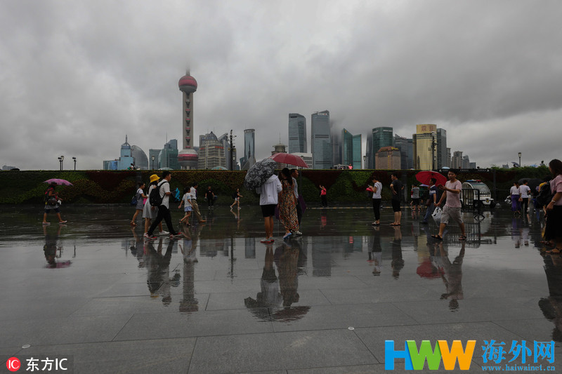 上海游客在台风天去外滩光景平台游玩。