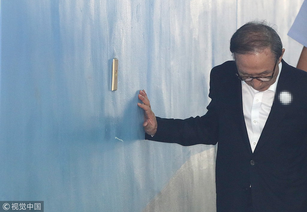 当地时间2018年8月14日,韩国首尔,韩国前总统李明博被押送至首尔中央地方法院,再次出庭受审。此前据韩媒报道,77岁的李明博遭到16项指控,包括涉嫌受贿111亿韩元及贪污350亿韩元等。