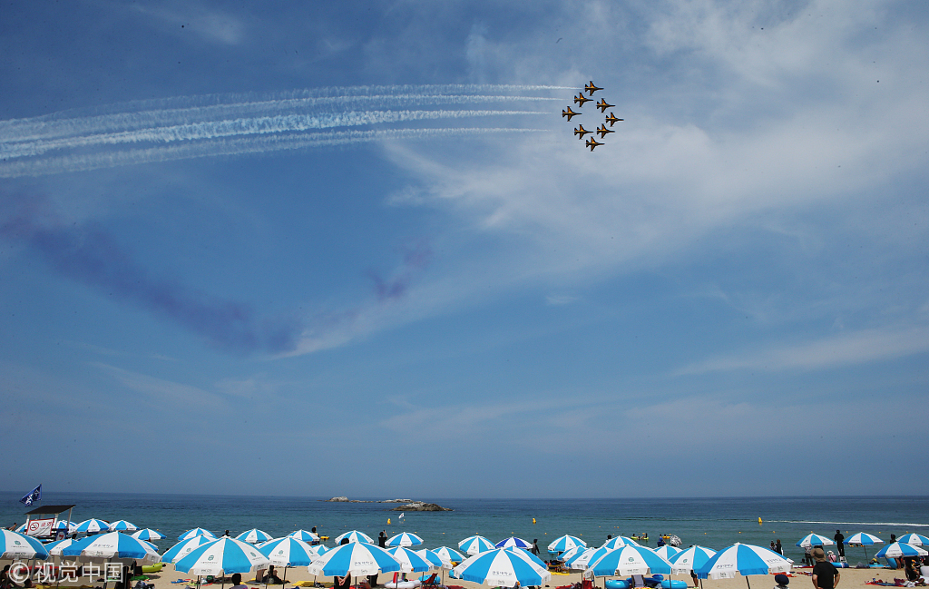 韩国空军黑鹰特技飞行队献技,海滩游客边避暑边赏飞行大片。