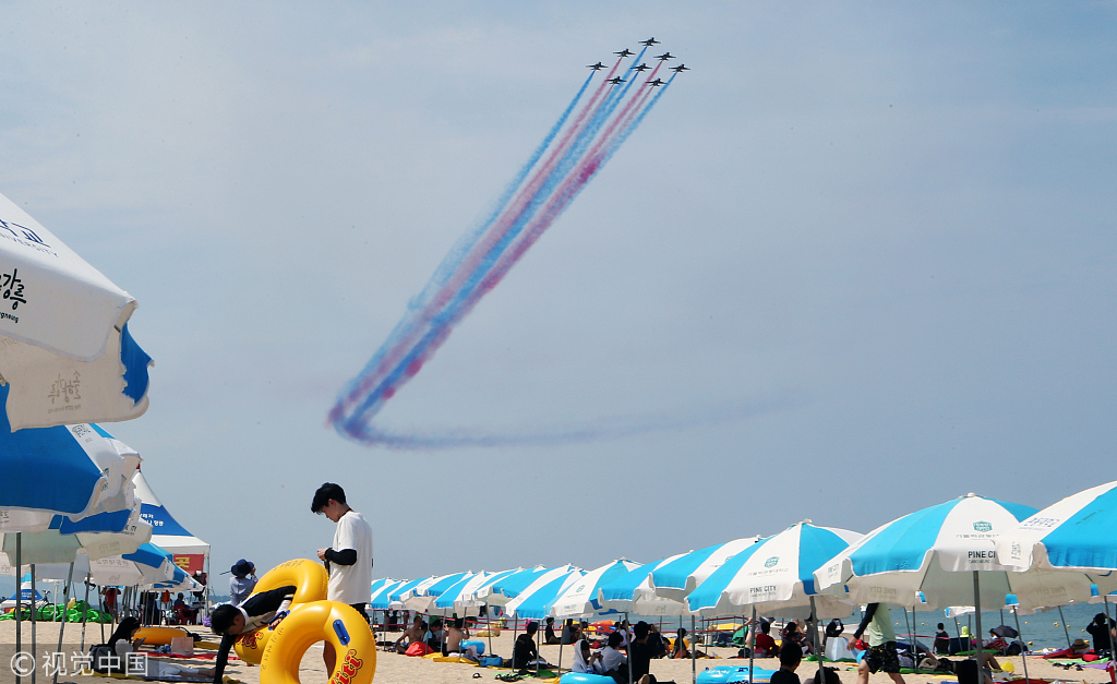 韩国空军黑鹰特技飞行队献技,海滩游客边避暑边赏飞行大片。