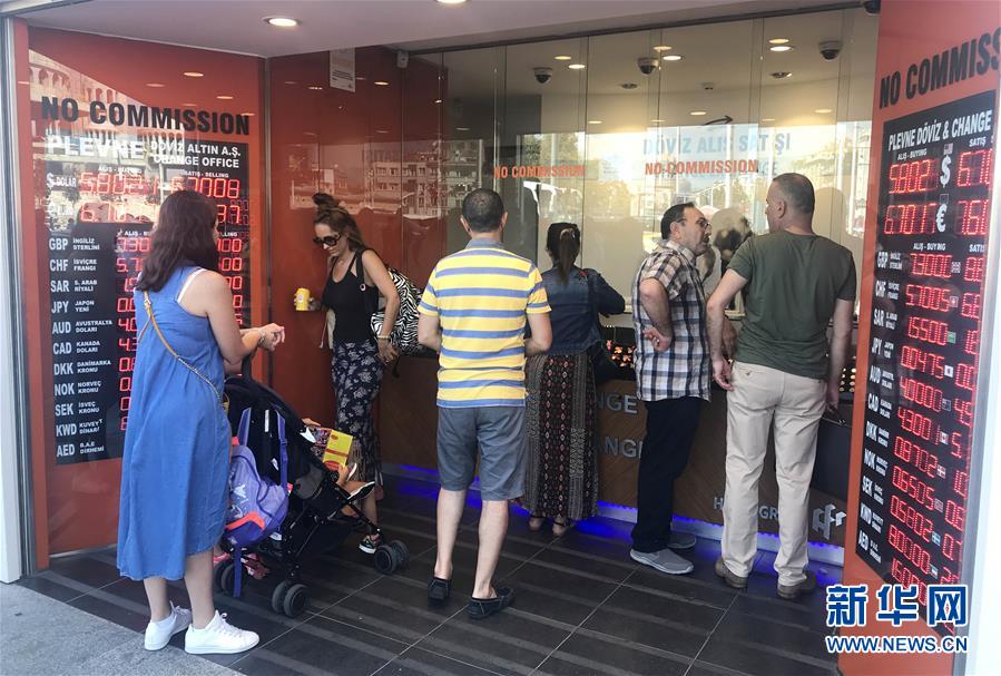 8月14日,在土耳其伊斯坦布尔,人们在一处货币兑换点换钱。连日来土耳其货币里拉汇率暴跌,今年以来跌幅已达45%。土耳其总统埃尔多安13日表示,土耳其经济正在遭受“攻击”,但土耳其有能力抵御这一攻击。新华社发(坚克·巴克兰摄)