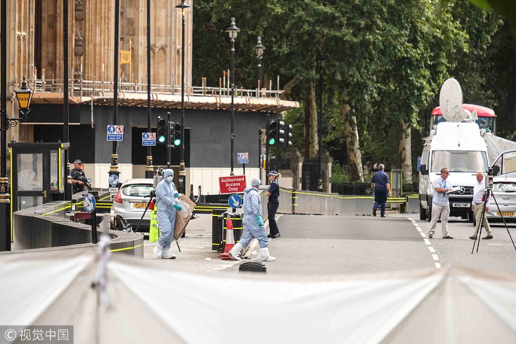 ​当地时间2018年8月14日,英国伦敦,伦敦警察厅称,一名男子驾驶汽车冲撞议会大厦外的安全护栏。