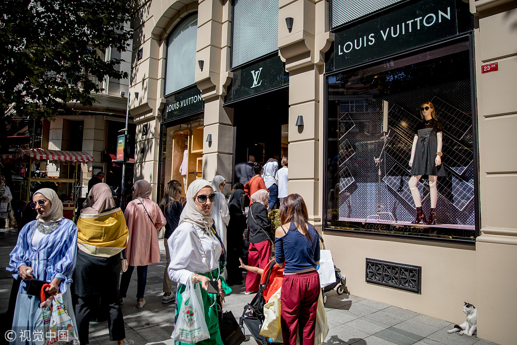当地时间2018年8月13日,土耳其伊斯坦布尔,游客在当地商业区旅游购物。由于土耳其里拉的暴跌,土耳其的奢侈品突然变得十分便宜,引来大量外国游客排队抢购。