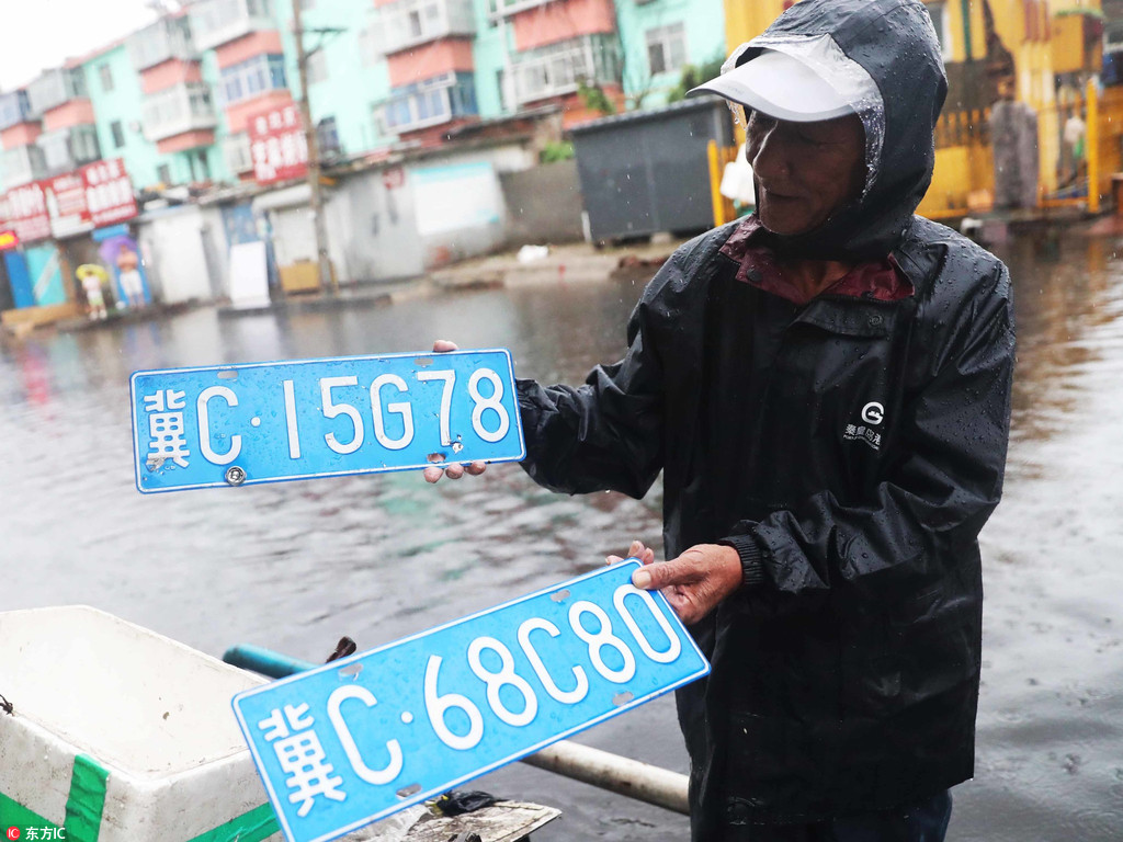 据了解,退休后的大爷在工人北里社区新开里小区居住,十几年如一日,每逢雨季都是董师傅带着老伴两个人一起清理居安中路的井篦子。图为董万华展示清掏出来的车牌。