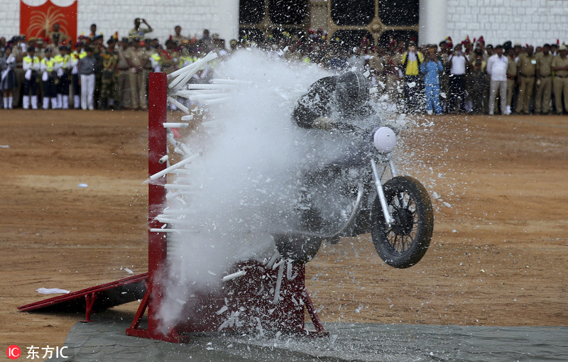 印度多地庆祝独立日 士兵表演飞车钻火圈特技