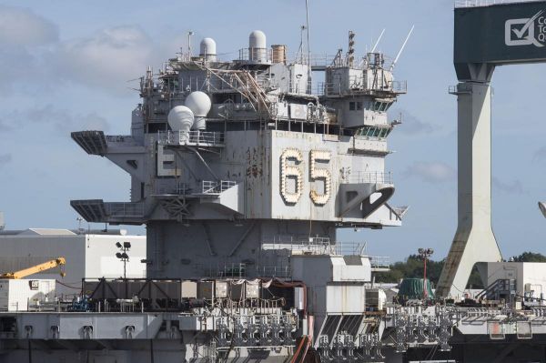 资料图片:正在拆解中的“企业”号核航母舰岛特写。(图片来源于网络)