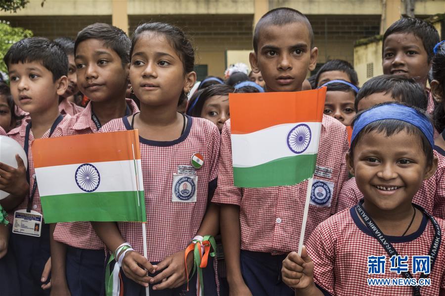 8月15日,在印度加尔各答,学生参加独立日庆祝活动。 新华社发(通帕·蒙达尔摄)