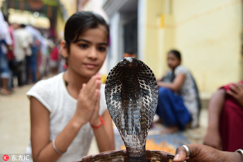 当地时间2018年8月15日,印度阿拉哈巴德,印度教信徒在Nagvasuki寺庙向眼镜蛇献贡品,庆祝蛇节(Nag panchami)。