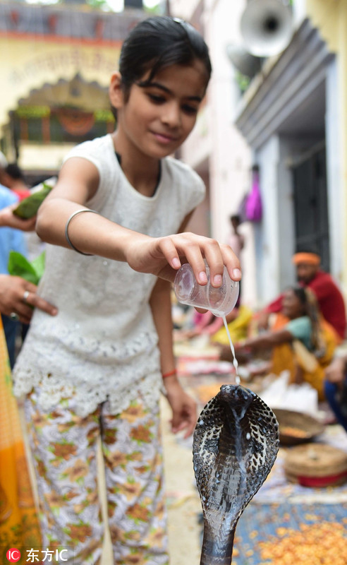 当地时间2018年8月15日,印度阿拉哈巴德,印度教信徒在Nagvasuki寺庙向眼镜蛇献贡品,庆祝蛇节(Nag panchami)。
