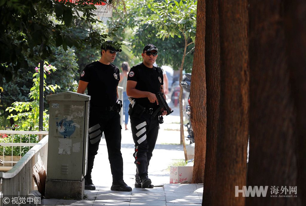 当地时间2018年8月16日,土耳其伊兹密尔,警察在美国牧师布伦森的家外巡逻。
