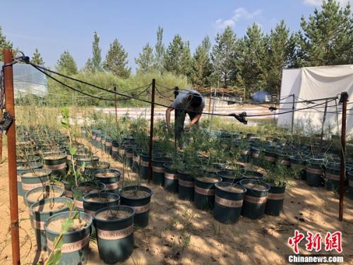 盐池县与北京林业大学合作建立荒漠化研究检测基地所搭的实验大棚和盆栽。姜雨薇 摄