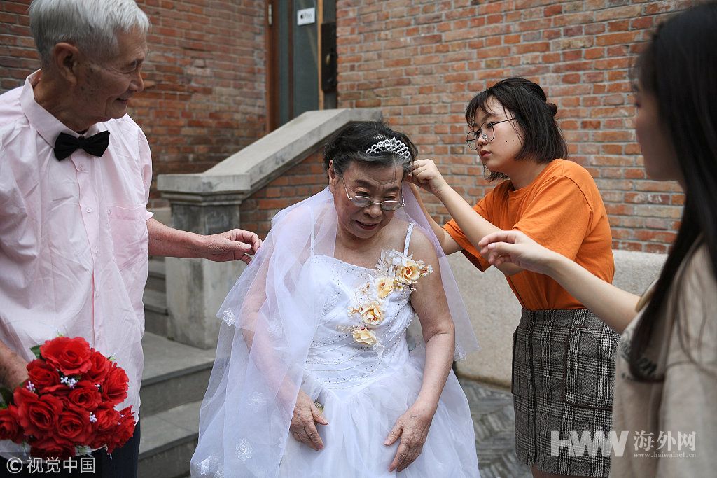 2018年8月16日,天津,七夕前一天,结婚超过50年的老年夫妇参加婚纱照拍摄活动。