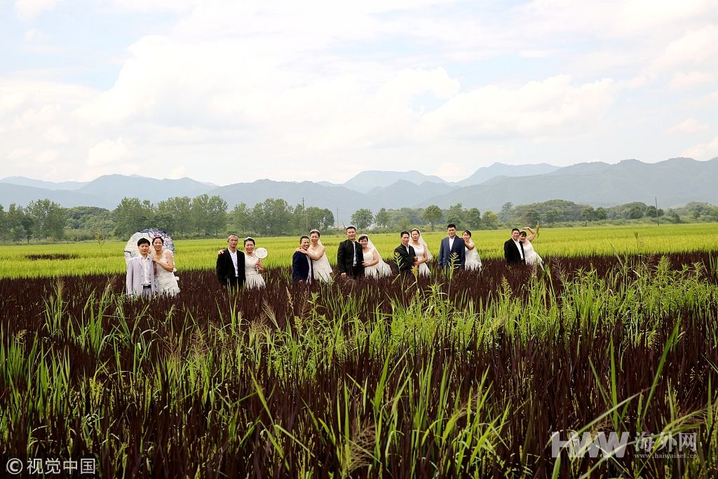 2018年8月15日,江西吉安,吉水县金田粮油公司为7对没有拍过婚纱照的员工提供免费拍婚纱照服务,在乌江镇枫坪彩色水稻基地给他们送上一份特别的七夕礼物。