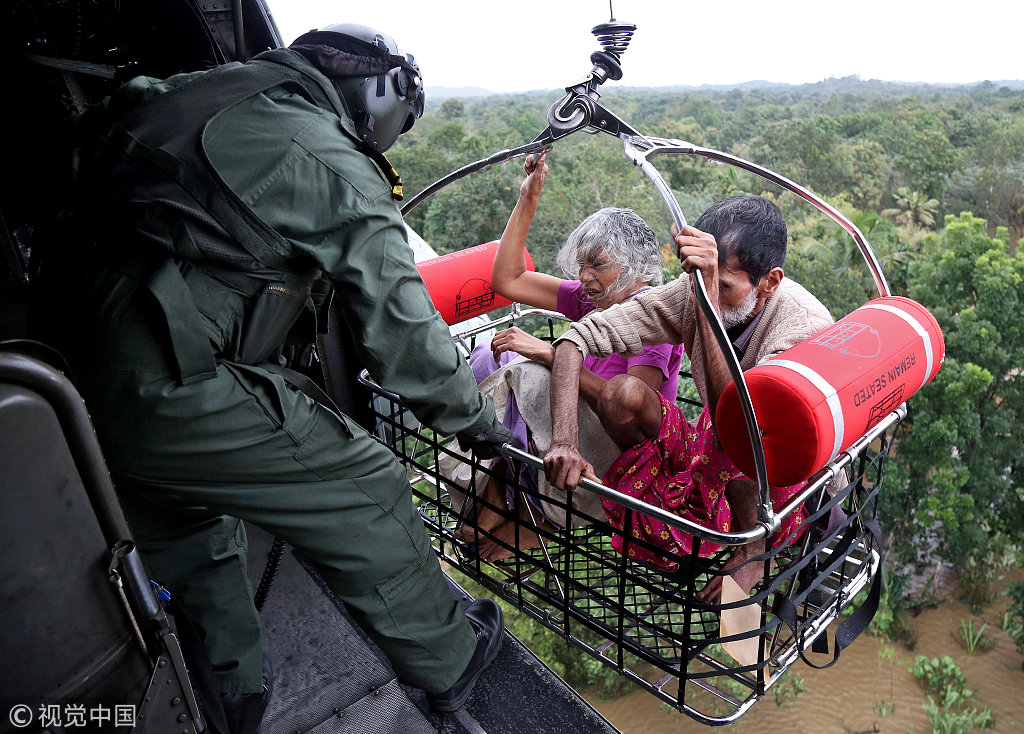 当地时间2018年8月17日,印度喀拉拉邦,印度海军士兵救援洪水中的被困民众。