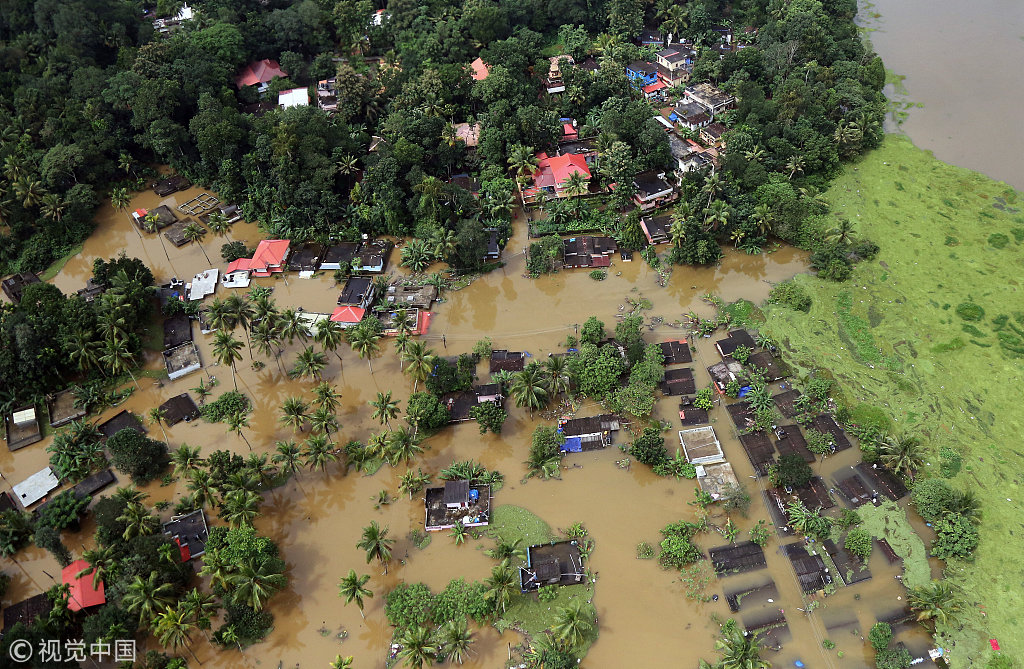 印度喀拉拉邦洪水淹没房屋 当局出动海军士兵转移民众