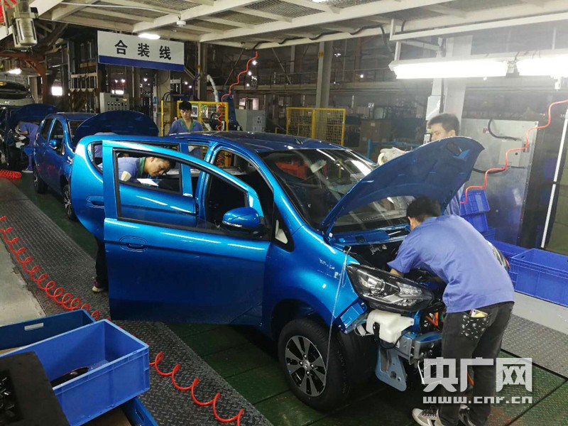 总装厂内,工人正在为新车安装底盘。底盘安装是成车的重要工序,应用了自动化程度较高的AGV循环小车进行安装。(央广网记者 高寒露 摄)