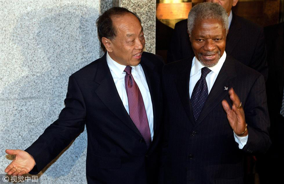 2004年10月11日,北京,中国外交部长李肇星(左)迎接联合国秘书长安南。