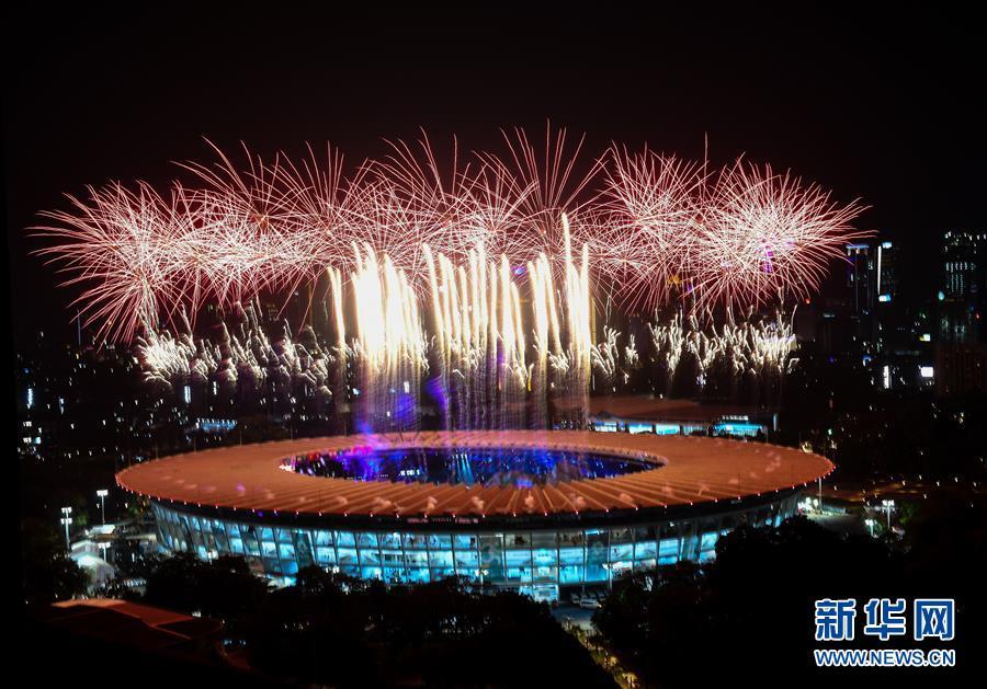 8月18日,第18届亚运会开幕式在印度尼西亚雅加达举行。这是开幕式上燃放烟花(8月18日摄)。新华社记者李响摄