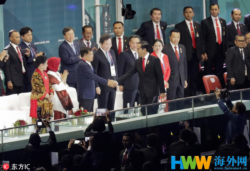 当地时间2018年8月18日,印度尼西亚雅加达,2018年雅加达亚运会开幕式。印尼总统佐科-维多多同多国领导人出席。