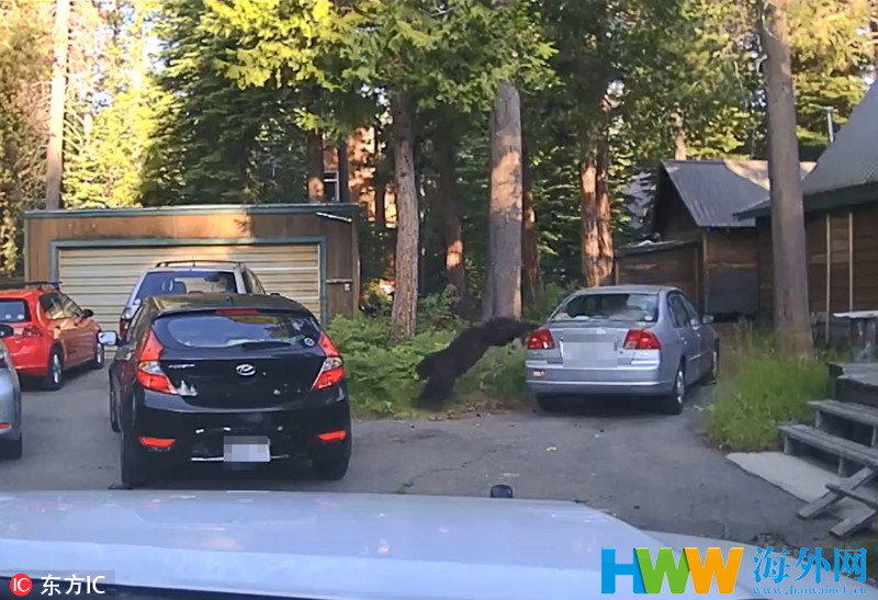 美棕熊开门“劫车”被困 警方击碎窗户助其逃生