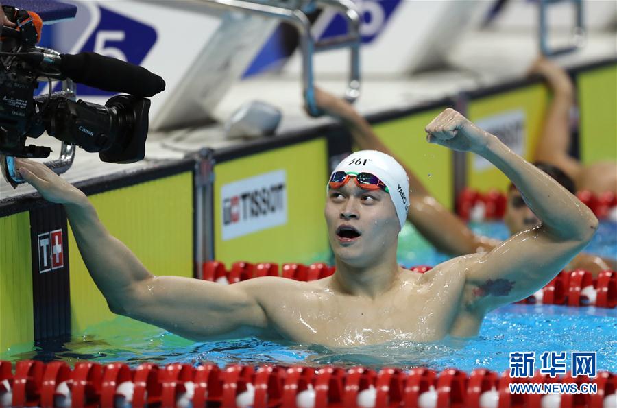 8月19日,中国选手孙杨在获胜后庆祝。当日,在第18届亚运会男子200米自由泳决赛中,中国选手孙杨以1分45秒43的成绩夺冠。新华社记者费茂华摄