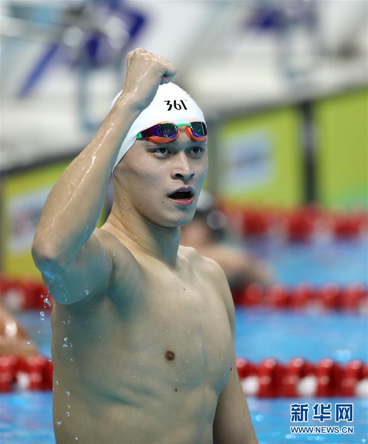8月19日,中国选手孙杨在获胜后庆祝。   当日,在第18届亚运会男子200米自由泳决赛中,中国选手孙杨以1分45秒43的成绩夺冠。   新华社记者费茂华摄