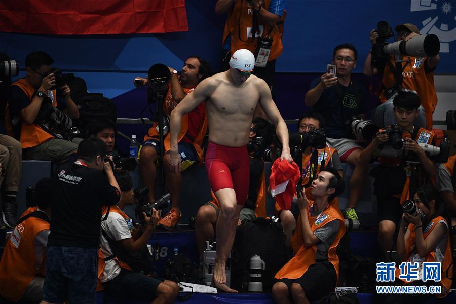 8月19日,中国选手孙杨(中)在赛后庆祝。当日,在第18届亚运会男子200米自由泳决赛中,中国选手孙杨以1分45秒43的成绩夺冠。新华社记者李响摄