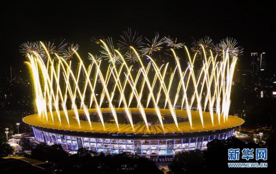 8月18日,第18届亚运会开幕式在印度尼西亚雅加达举行。这是开幕式上燃放烟花(8月18日摄)。新华社记者潘昱龙摄