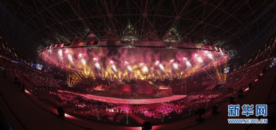 8月18日,第18届亚运会开幕式在印度尼西亚雅加达举行。 这是开幕式上燃放烟花(8月18日摄)。 新华社记者李响摄