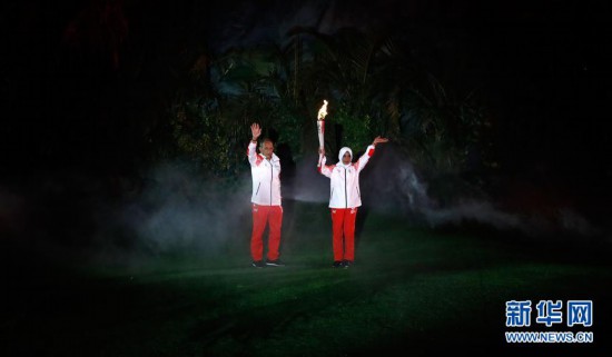 8月18日,火炬手在交接火炬。 当日,第18届亚运会开幕式在印度尼西亚雅加达举行。 新华社记者王丽莉摄