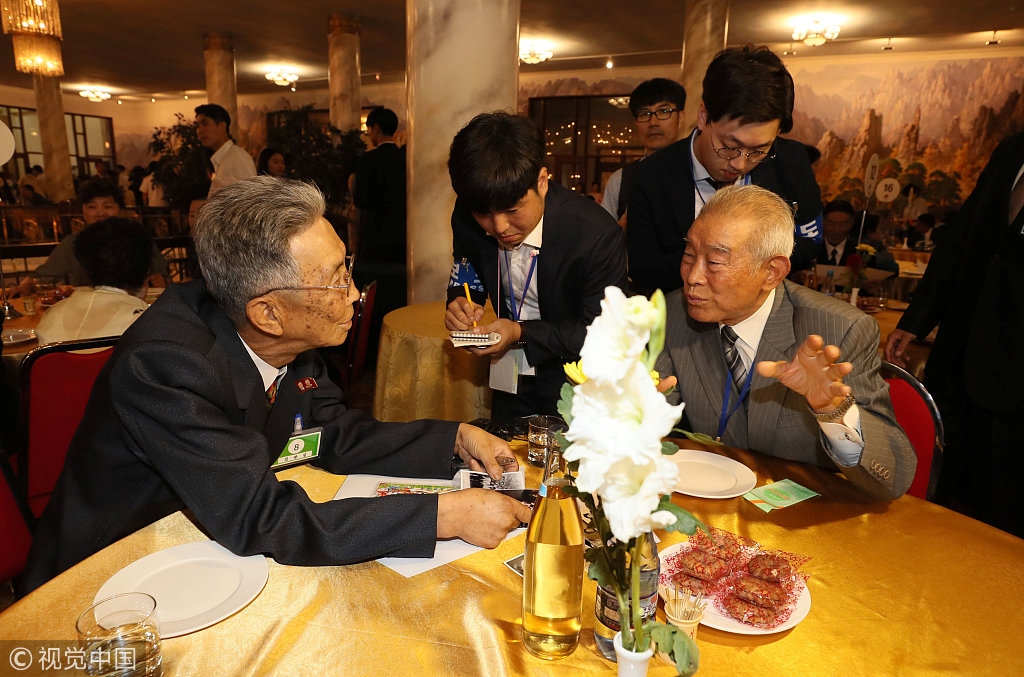 当地时间2018年8月20日,朝鲜金刚山,第21次韩朝离散家属团聚活动首场见面会举行。参加第一轮韩朝离散家属团聚活动的89名韩方家属20日吃过午餐后,探亲团于当天下午3时(北京时间下午2时)在金刚山酒店与185名朝方亲人会面。