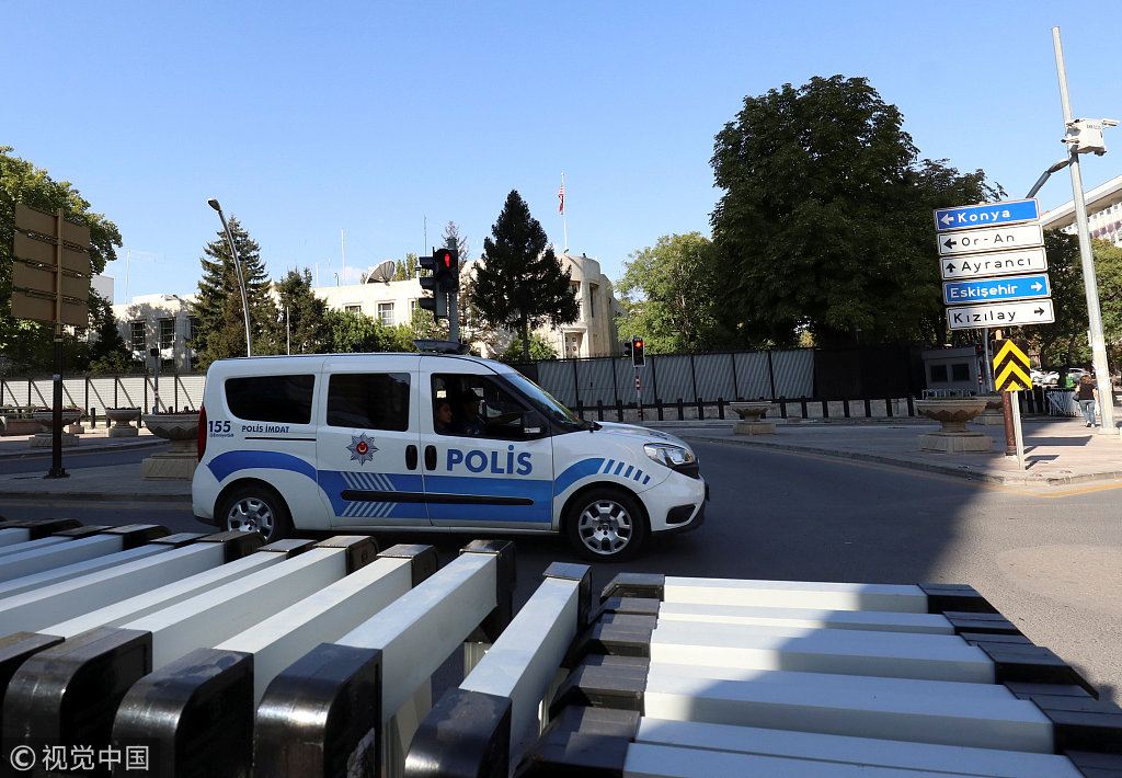 当地时间2018年8月20日,土耳其安卡拉,一名未知枪手从移动轿车上向位于安卡拉的美国驻土耳其大使馆连开数枪,击碎一扇窗。本次袭击事件没有造成人员伤亡,当地警方正在追寻嫌犯。